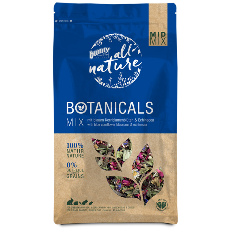 … the »all nature BOTANICALS MAXI MIX and MID MIX« are particularly good due to their fine ingredients and natural composition. The mixture corresponds to the natural diet of herbivores and ideally completes their daily menu. All varieties taste deliciously fresh and provide a tasty variety.