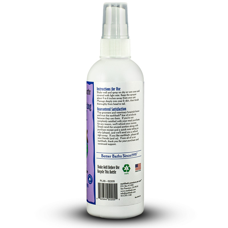 This 3-in-1 Deodorizing Spritz naturally conditions and detangles coats, while deodorizing with the fresh botanical fragrance of lavender oil. Organic aloe vera and vitamin E leave the coat exceptionally soft and bright. Use between baths to freshen, condition and detangle, or as a finishing spray after bathing your dog with earthbath® Coat Brightening Shampoo. Safe for dogs over 6 weeks old. Not for use on cats.