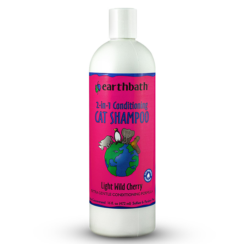 | Earth bath specially formulated this gentle 2-in-1 conditioning shampoo for our finest furred feline friends. PH-balanced for mildness, this luxurious shampoo contains the finest blend of natural cleansers, supple conditioners, and aloe vera. Natural conditioners and aloe vera soften the coat, re-moisturize the skin, and add manageability, brilliance and shine. Our ultra-mild coconut-based cleansers and the subtle scent of wild cherries will leave her smelling fresh and deliciously clean. Will not wash off topical flea applications. Safe for all animals over 6 weeks old. To encourage peaceful co-existence in multi-cat households, use our Fragrance Free Hypo-Allergenic Cat Shampoo.