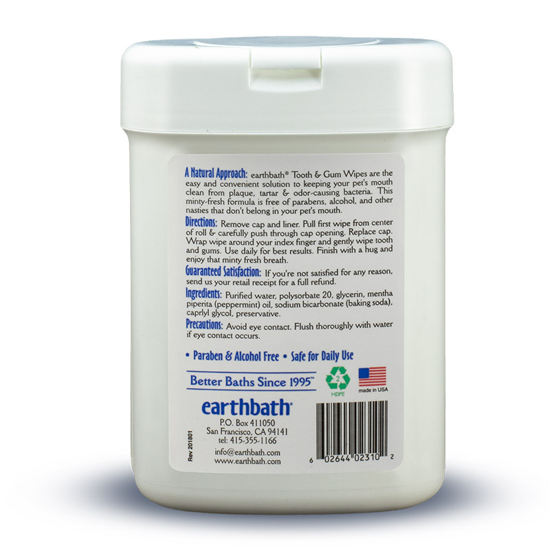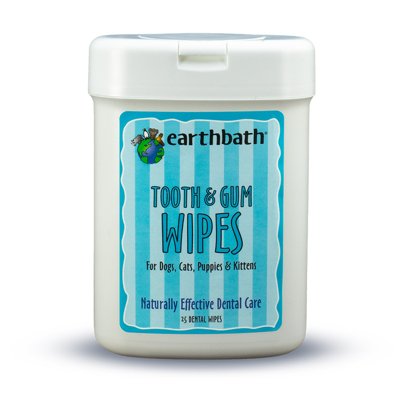 | Earth bath Tooth and Gum Wipes are the easy and convenient solution to keeping your pets mouth clean from plaque, tartar and odor-causing bacteria. Our totally natural formula is free of parabens, alcohol, and other nasties that dont belong in your pets mouth. Use daily for best results.