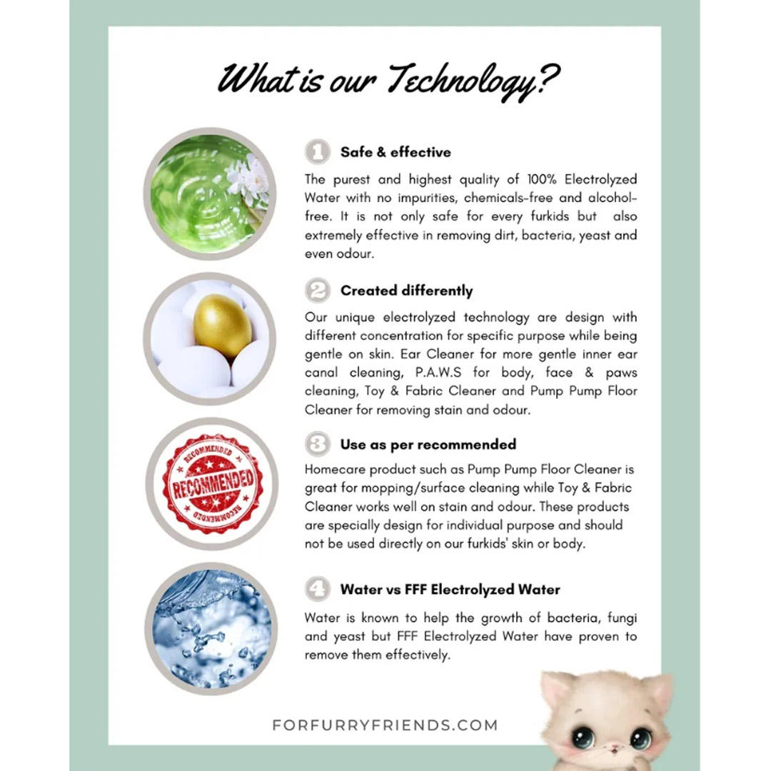 Using Japanese technology removes 99.9% of bacteria, germs and viruses without chemicals, alcohol or surfactants. For Furry Friends Floor Cleaner is 100% safe for babies and pets.
