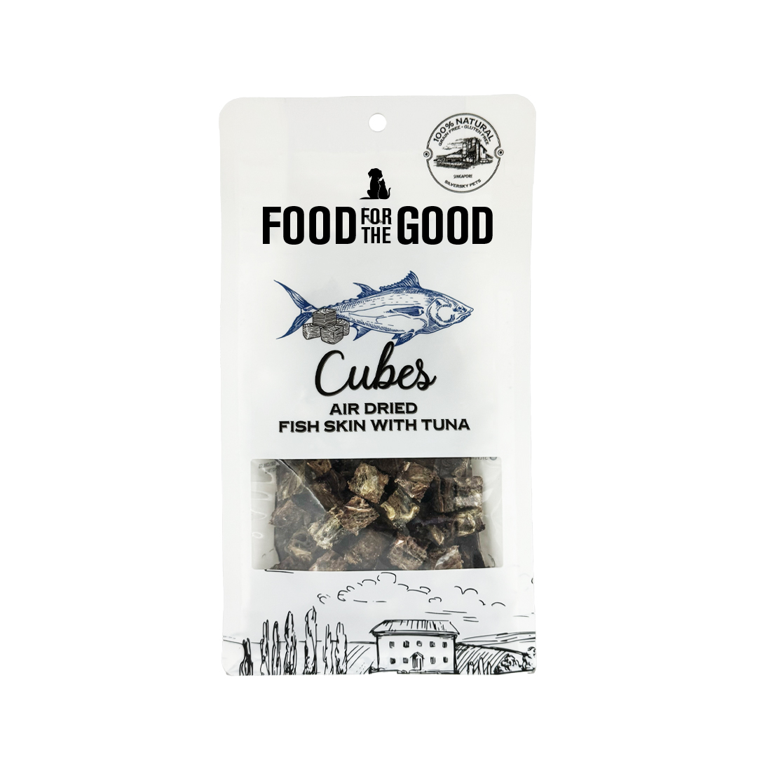 Food For The Good Air Dried Fish Skin with Tuna & Salmon Cubes is an excellent source of protein, suitable for both dogs and cats. Made from 100% Tuna & 100% Salmon, the treats are gently Freeze Dried to retain all the nutrients and flavor your pet craves! These treats are grain-free, gluten-free, without any added preservatives and antibiotics.