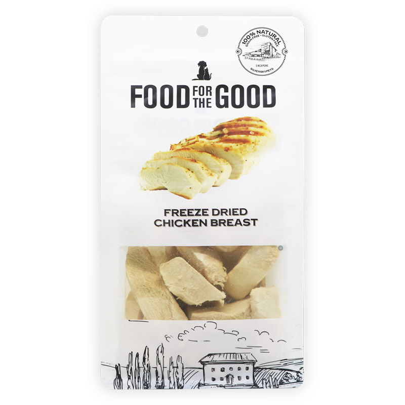 Food For The Good Freeze Dried Chicken Breast is high in protein, suitable for both dogs and cats. Made from 100% Chicken Breast, the treats are gently Freeze Dried to retain all the nutrients and flavor your pet craves! These treats are grain-free, gluten-free, without any added preservatives and antibiotics.