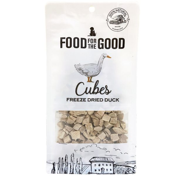 Food For The Good Freeze Dried Duck Cubes is an excellent source of protein, suitable for both dogs and cats. Made from 100% Duck Breast, the treats are gently Freeze Dried to retain all the nutrients and flavor your pet craves! These treats are grain-free, gluten-free, without any added preservatives and antibiotics.
