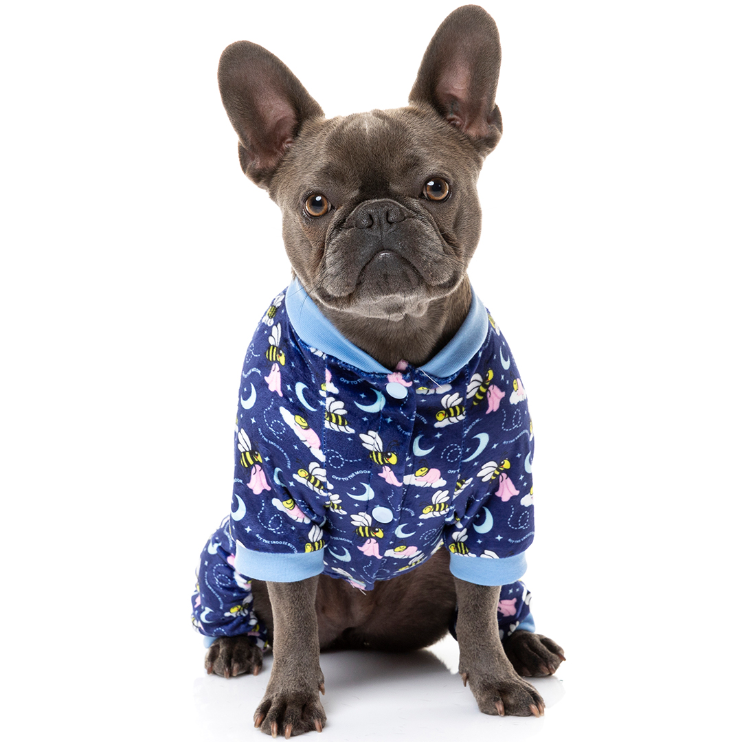 What’s stripey and flies at 384,400 km in the air? A bee flying around the moon! This cute lil design features sleepy bees on clouds surrounded by the stars and a blue moon. A colourful design that is sure to make your pup dream easy.
