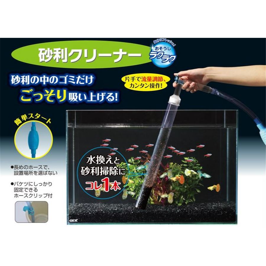 One hand to operate, gravel cleaning is easy! You can clean with a longer pipe deep into the gravel. It is possible to secure the hose in a bucket as it comes with a hose holder. It is suited for small standard aquarium. Available in width 60cm aquarium of up to a height of 36cm.
