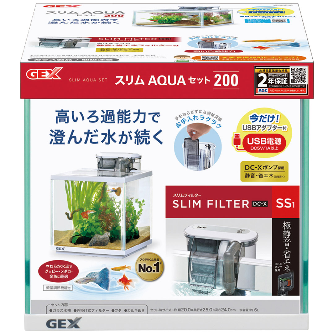 Set contents: Glass aquarium, external hanging filter (Slim Filter DC-X SS1), lid, dechlorinator.