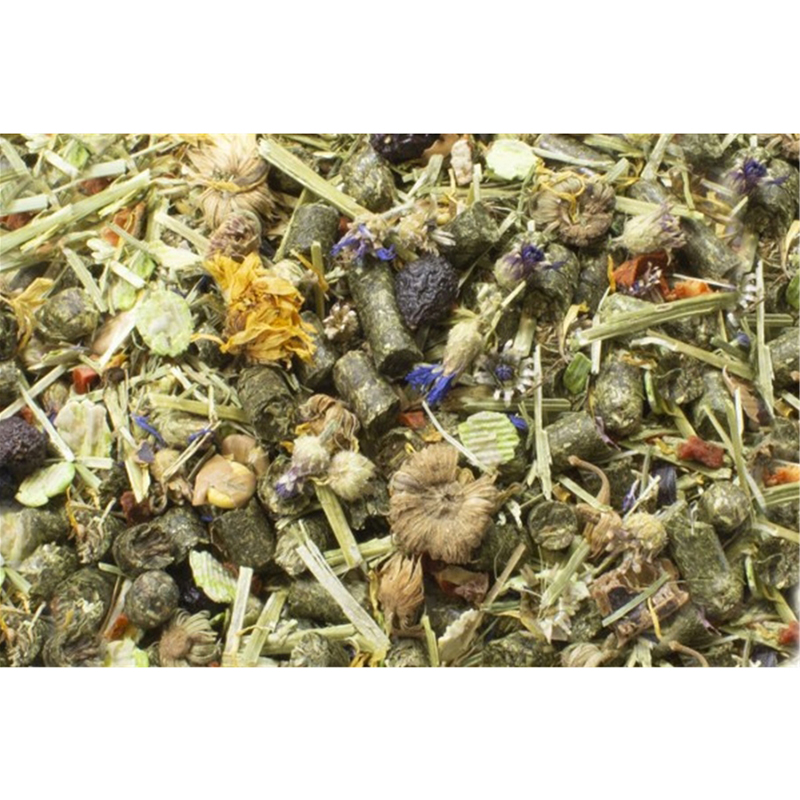 | Growth of permanent grassland in the foothills of the Alps (consisting of, among other things, timothy grass [timothy grass], foxtail, smooth oat, cocksfoot, downy oat, meadow meadow grass, red clover, buttercup, sallow grass, woolly honey grass, golden oat, narrow-leaved vetch, hop trefoil, dandelion, Ribwort plantain, cowslip, marguerite, daisy, burnet burnet, goosegrass, parsnip, sorrel, germander speedwell, common tomentosum, perennial ryegrass, soft brome, tufted vetch, witch vetch, trident orchid, bulbous buttercup, lesser rattler, cow parsley, yarrow), Pea flakes, rose hips 5%, broad bean flakes, carob, alfalfa, parsley 3%, marigold blossoms, carrots, cornflower blossoms, yucca |