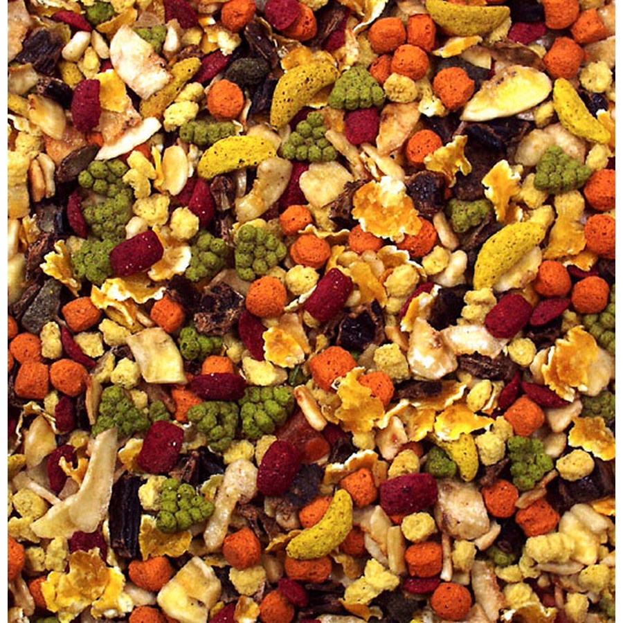 | Extracted corn- and ricemeal, bananas 22%, corn flakes, carob, pineapple 7.2%, apricots 4.8 %, beetroots 2% | Protein 6.1%, fat content 9.6%, crude fibre 3.9%, raw ash 2.0% |