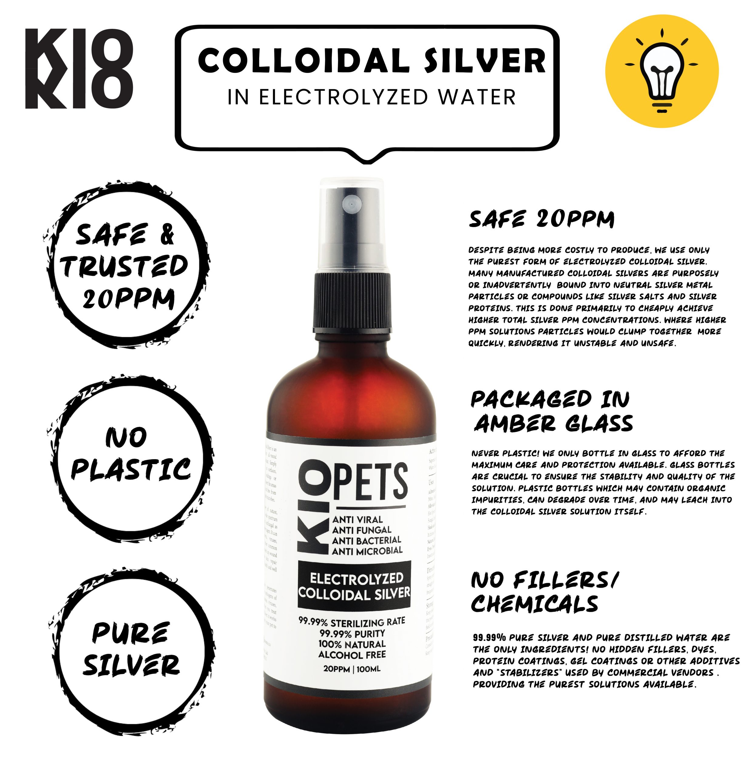 Harnessing the Power of Nature, KIO Electrolyzed Colloidal Silver is a wide spectrum antimicrobial, antiviral, antifungal and anti-inflammatory agent. It effectively kills bacteria, viruses, protozoa, yeast and other common pathogens as well as speed up wound healing and promote skin repair improving the overall health and wellbeing of your pets.