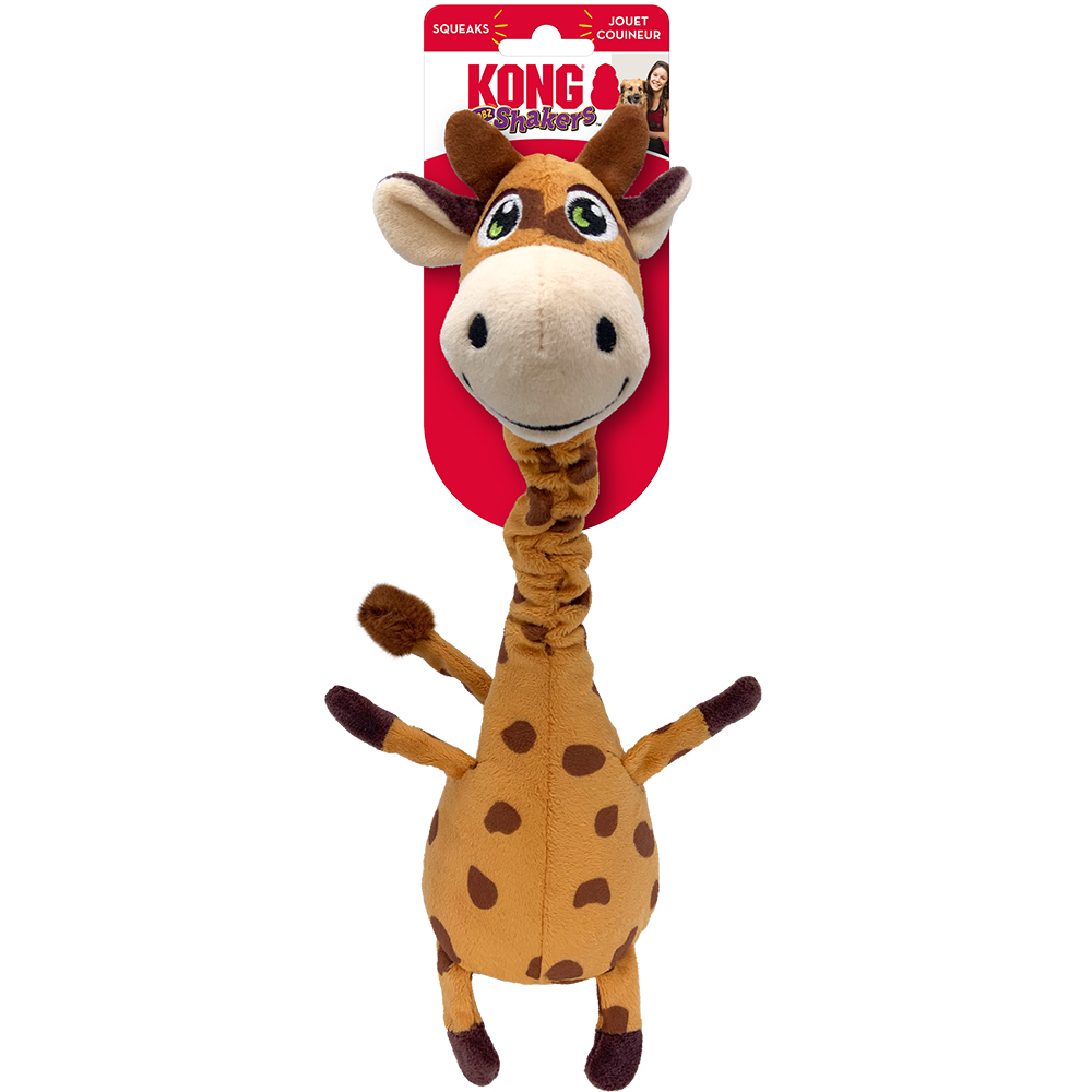 KONG Shakers Bobz Giraffe has a tough, flexible cord in his wobbly neck that lets him nod an invitation to thrash his long, floppy body in an instinct-satisfying safari of shaking. The low-toned squeaker prolongs playtime while a layer of reinforcement extends the tugging, fetching and flinging fun.
