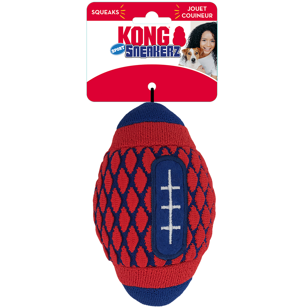 KONG Sneakerz Sport features a textured tennis shoe material that provides durability for long-lasting runs of fun. The grippy toy features a puffy, compressible exterior that satisfies instinctual needs. The football shape is ideal for indoor and outdoor sessions and the multiple squeakers are sure to extend and last into overtime.