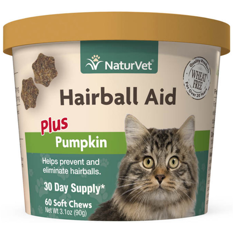 NaturVet Hairball Aid Plus Pumpkin Soft Chews help eliminate and prevent hairballs when used on a daily basis.