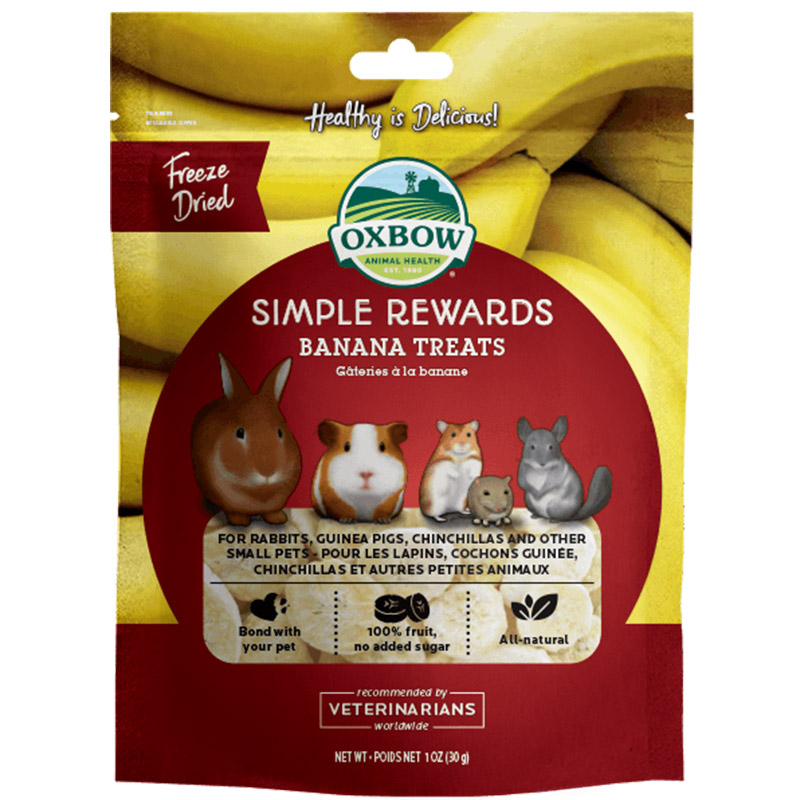 Refreshingly simple and naturally sweet, Simple Rewards Banana Treats are a great choice when you want to reward your pet. Unlike many snacks on the market that contain added sugar, our premium Banana Treats consist of only 100% banana, harvested and freeze dried at the peak of ripeness to ensure the freshest, best- tasting treat for your special pet. Our treats are a natural source of Vitamin B6 and potassium. Use Oxbow’s all-natural Banana Treats to add variety and enrichment to your pet’s diet. Keep it simple with Simple Rewards