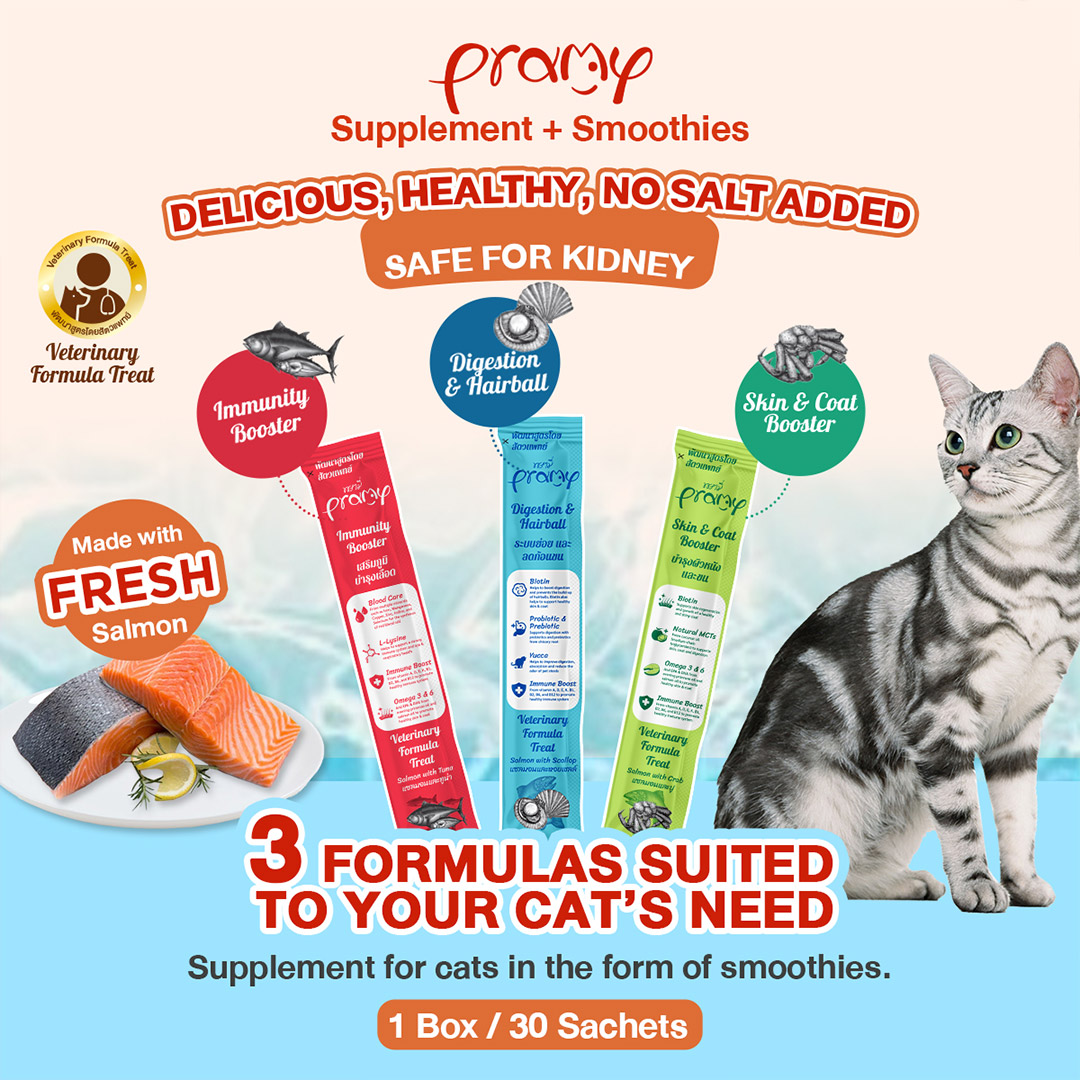 Indulge your cat with the wholesome benefits of Pramy Vitamin Treats, a veterinarian-formulated supplement smoothie crafted with fresh salmon. Prioritizing kidney safety by containing no added salt, these treats offer a delightful taste experience. Explore a variety of unique formulas, each thoughtfully designed and packed with nourishing nutrients to meet different feline needs.