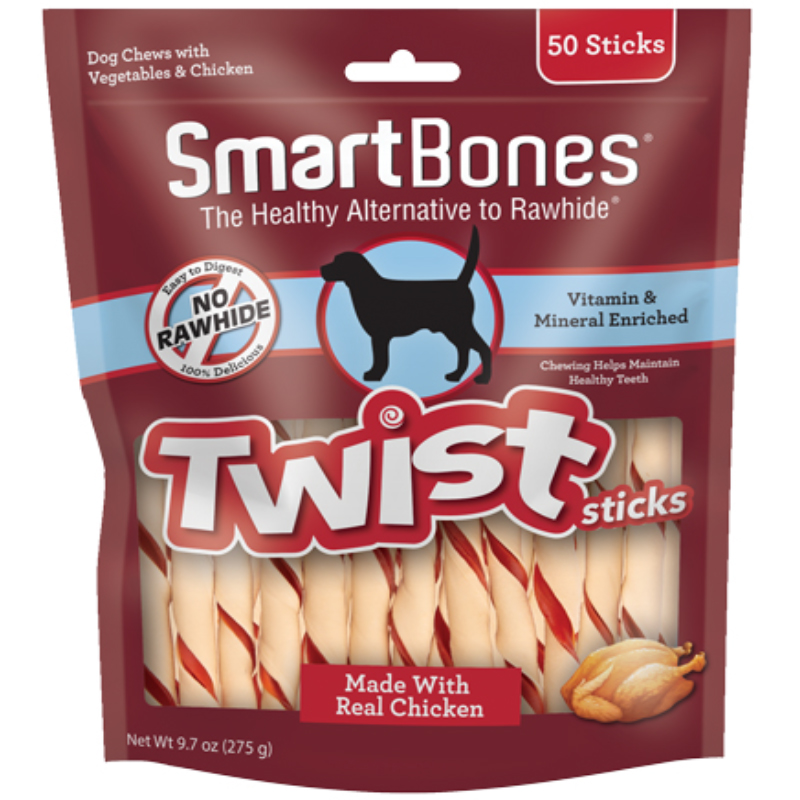 SmartBones are rawhide free and highly digestible – made with wholesome vegetables, real chicken, and enriched with vitamins & minerals! Chewing helps maintain healthy teeth.