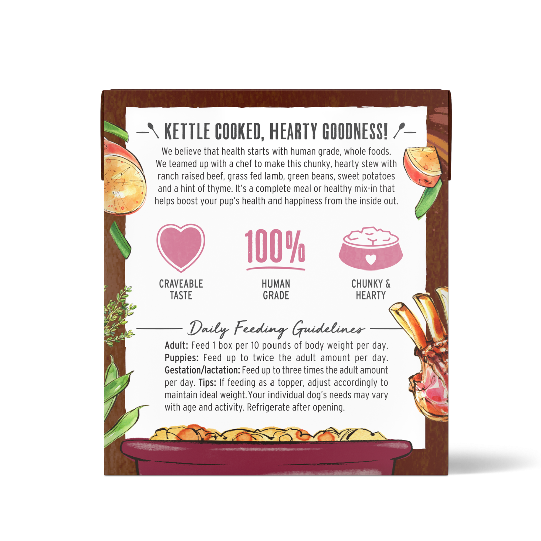 We believe that health starts with human grade, whole foods. We teamed up with a chef to make this chunky, hearty One Pot Stew with ranch raised beef, grass fed lamb, green beans, sweet potatoes and a hint of thyme. Serve this hearty wet food as a complete meal or healthy mix-in that helps boost your pup’s health and happiness from the inside out.