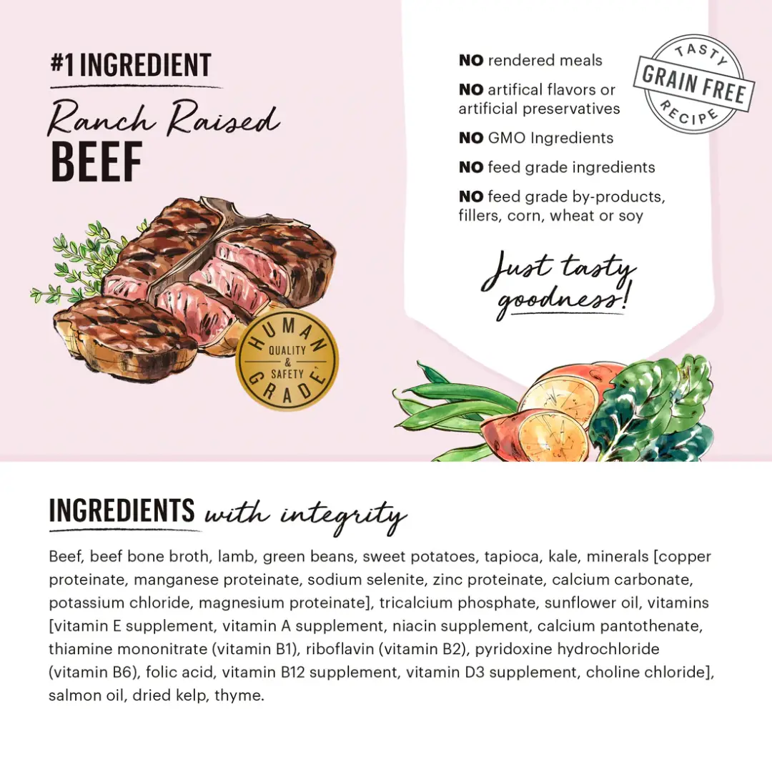 Beef, beef bone broth, lamb, green beans, sweet potatoes, tapioca, kale, minerals [copper proteinate, manganese proteinate, sodium selenite, zinc proteinate, calcium carbonate, potassium chloride, magnesium proteinate], tricalcium phosphate, sunflower oil, vitamins [vitamin E supplement, vitamin A supplement, niacin supplement, calcium pantothenate, thiamine mononitrate (vitamin B1), riboflavin (vitamin B2), pyridoxine hydrochloride (vitamin B6), folic acid, vitamin B12 supplement, vitamin D3 supplement, choline chloride], salmon oil, dried kelp, thyme.