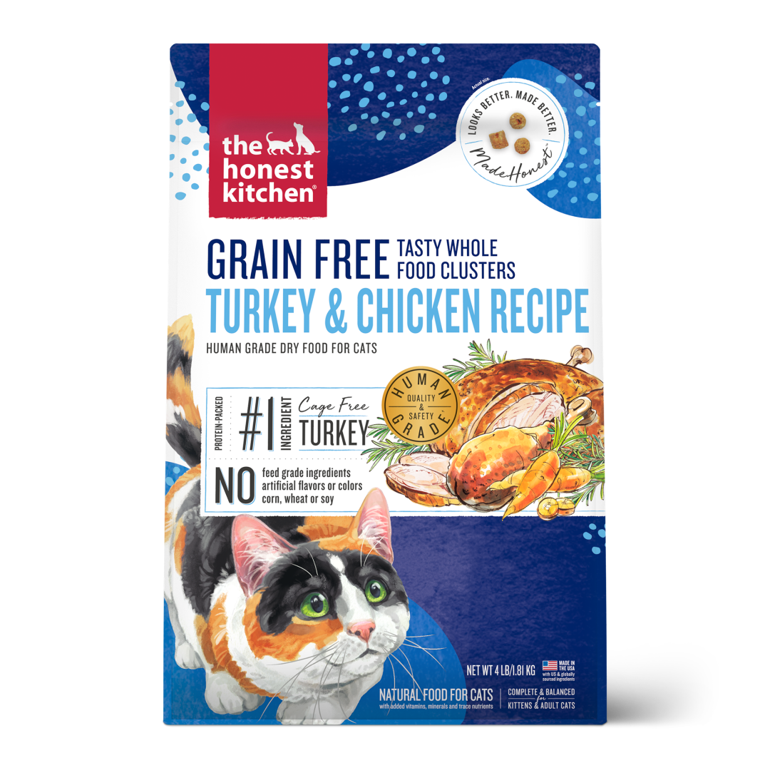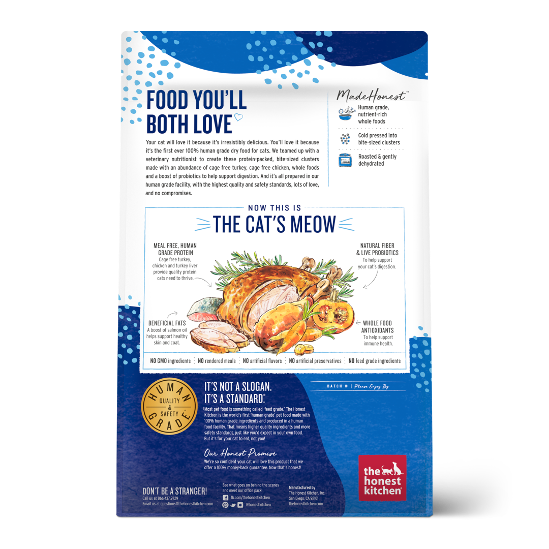 Your cat will love this savory turkey and chicken recipe because it’s irresistibly delicious. You’ll love it because it’s the first ever 100% human grade dry cat food. We teamed up with a veterinary nutritionist to create these protein-packed, bite-sized whole food clusters made with an abundance of cage free turkey and chicken, whole foods and a boost of probiotics to help support digestion. And it’s all prepared in our human grade facility with the highest quality and safety standards, lots of love and no compromises.