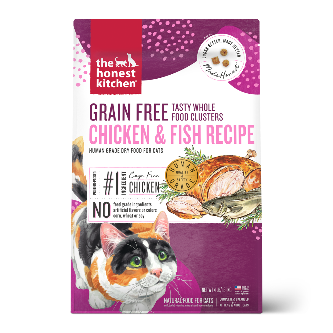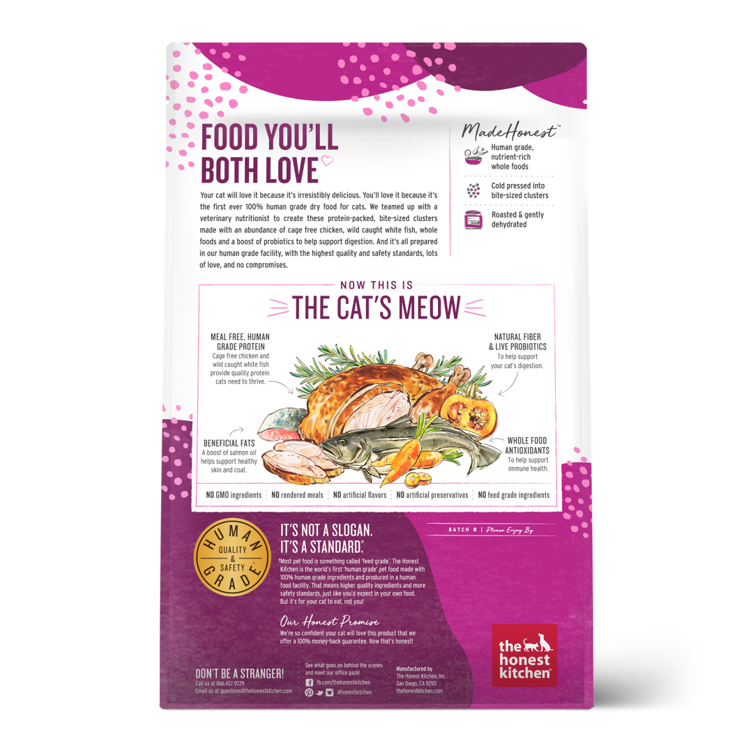 Your cat will love this grain free chicken and fish recipe because it’s irresistibly delicious. You’ll love it because it’s the first ever 100% human grade dry cat food. We teamed up with a veterinary nutritionist to create these grain free, protein-packed, bite-sized whole food clusters made with an abundance of cage free chicken and wild caught fish, whole foods and a boost of probiotics to help support digestion. And it’s all prepared in our human grade facility with the highest quality and safety standards, lots of love and no compromises.