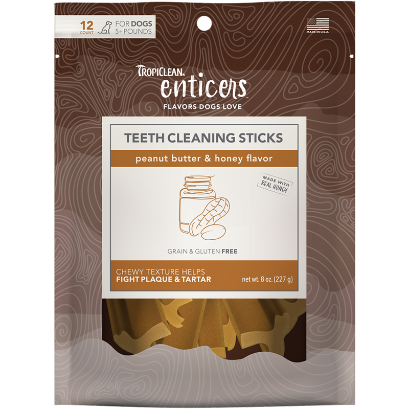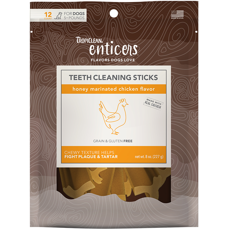 Now the flavors your dog loves are the flavors that give them clean teeth and a healthy mouth! TropiClean Enticers TeethCleaning Sticks are specially designed and textured to give your dog a complete teeth brushing with every bite. Theenticing flavors will leave their mouths watering for more! All Sticks are made with naturally derived ingredients and realbacon. Satisfy your dog’s innate desire for meaty goodness with one teeth cleaning stick per day.