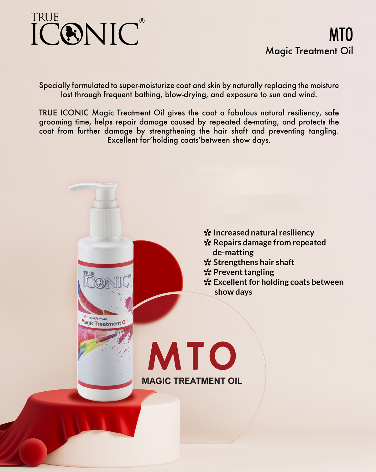 Specially formulated to super-moisturize coat and skin by naturally replacing the moisture lost through frequent bathing, blow- drying, and exposure to sun and wind. TRUE ICONIC Magic Treatment Oil gives the coat a fabulous natural resiliency, safe grooming time, helps repair damage caused by repeated de-mating, and protects the coat from further damage by strengthening the hair shaft and preventing tangling. Excellent for holding coats between show days.