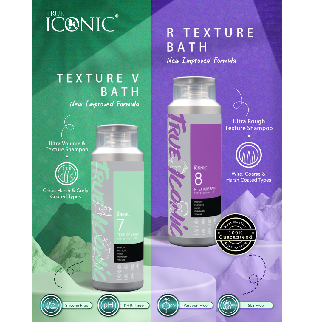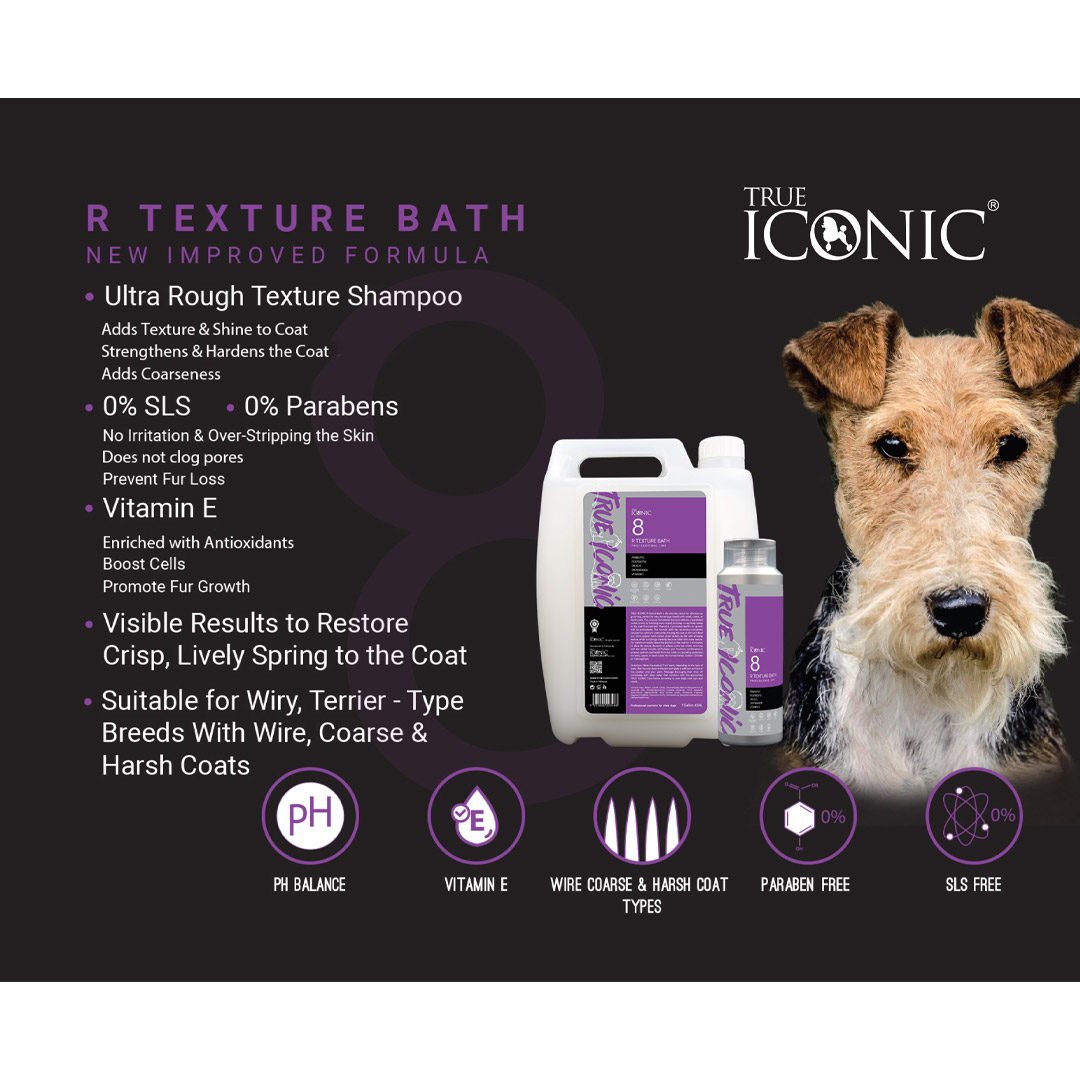 TRUE ICONIC R-Texture Bath is the ultimate choice for adventurous grooming, perfect for wiry, terrier-type breeds with wired, coarse, or harsh coats. This uniquely formulated shampoo delivers unparalleled visible results by fortifying every strand, restoring a crisp, lively spring to the coat. Enriched with Vitamin E, it promotes healthy fur growth with its antioxidants. The formula adds the necessary coarseness required for optimum coats while ensuring the coat or skin isn’t dried out. Once applied, hard-coated terrier jackets lay flat with amazing texture, while furnishings instantly become fuller with more texture. For maximum results, leave the product on the coat for 2-3 minutes to allow the texture elements to adhere to the hair shafts. And now, with the added benefits of Prebiotic and Postbiotic combination, it ensures optimal coat health from the inside out, providing perfection for wires, coarse, or harsh coats. No Animal Extract, Sodium Chloride or Coloring Dyes.