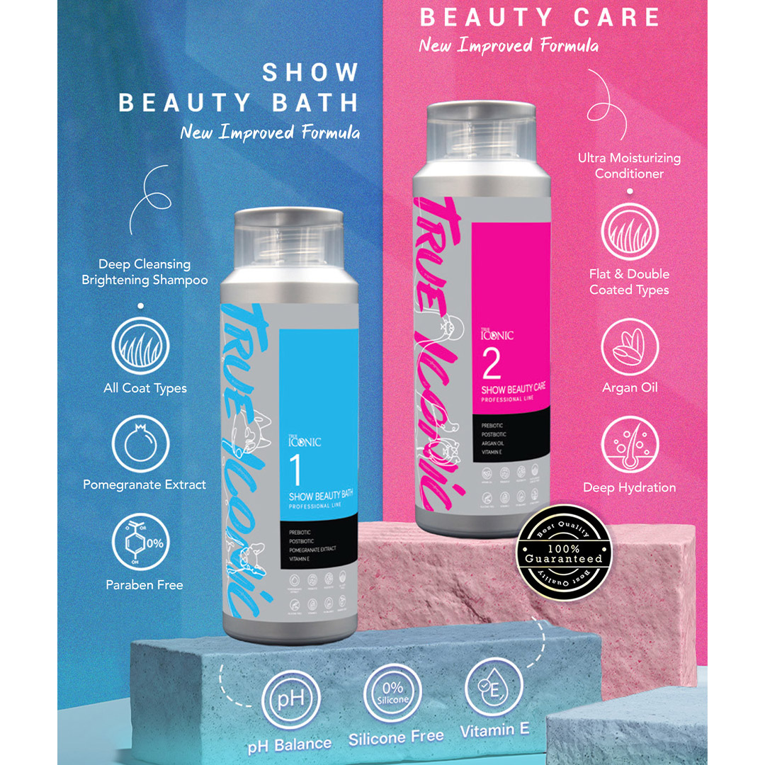 TRUE ICONIC Show Beauty Bath is specially formulated for all breeds, ensuring thorough cleansing that swiftly rinses out, leaving a sparkling, residue-free coat. It greatly reduces mats and tangles by selectively removing excess oil and dirt, preserving the natural oils essential for coat health. Safe for even the most sensitive skins and coats, including puppies and lactating female dogs. Enriched with all-natural ingredients like pomegranate extract and free from alcohol, oil, or silicone products, TRUE ICONIC Show Beauty Bath promotes fur growth, strengthens hair follicles, and enriches the coat’s natural color and texture. Vitamin E, with its antioxidants, boosts cells and encourages healthy fur growth. Plus, with the addition of Prebiotic and Postbiotic combination, it nurtures a balanced skin microbiome, further enhancing overall coat health and vitality. No Animal Extract, Sodium Chloride or Coloring Dyes.
