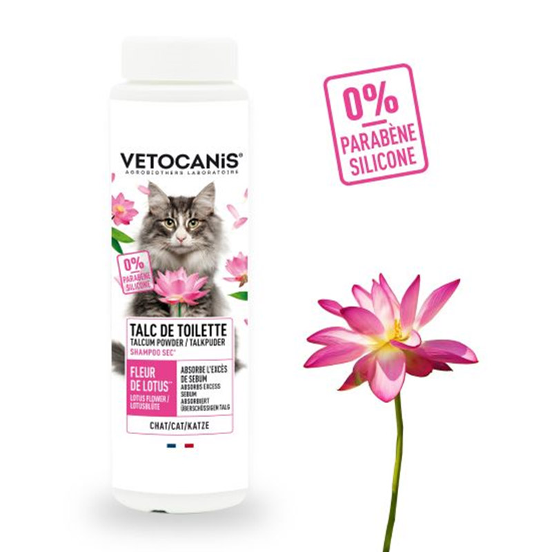 Containing no paraben or silicone, the VETOCANIS no-rinse dry shampoo, with a talcum powder base, cleanses your cat’s coat, absorbs excess sebum, and removes dirt. 150 ml format.