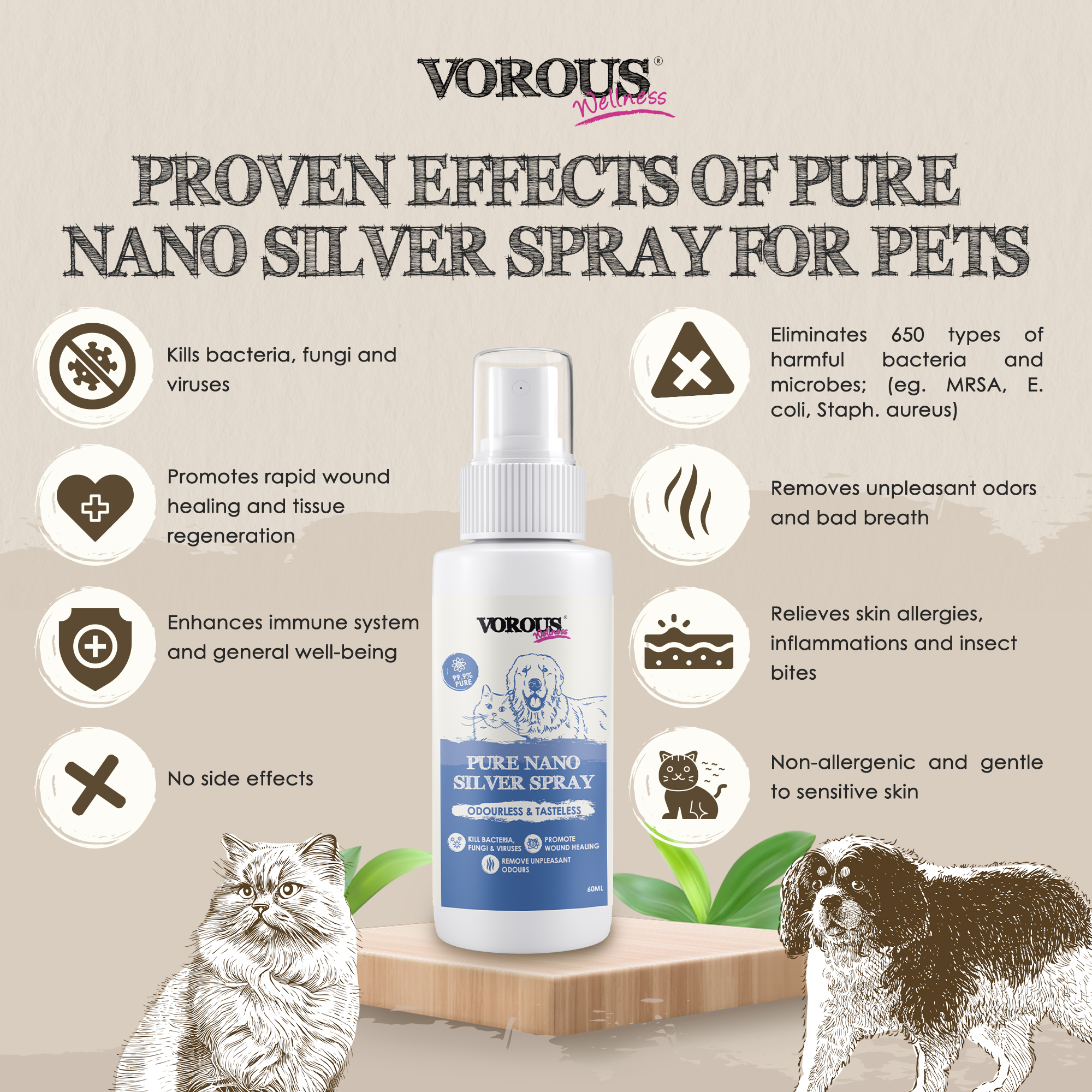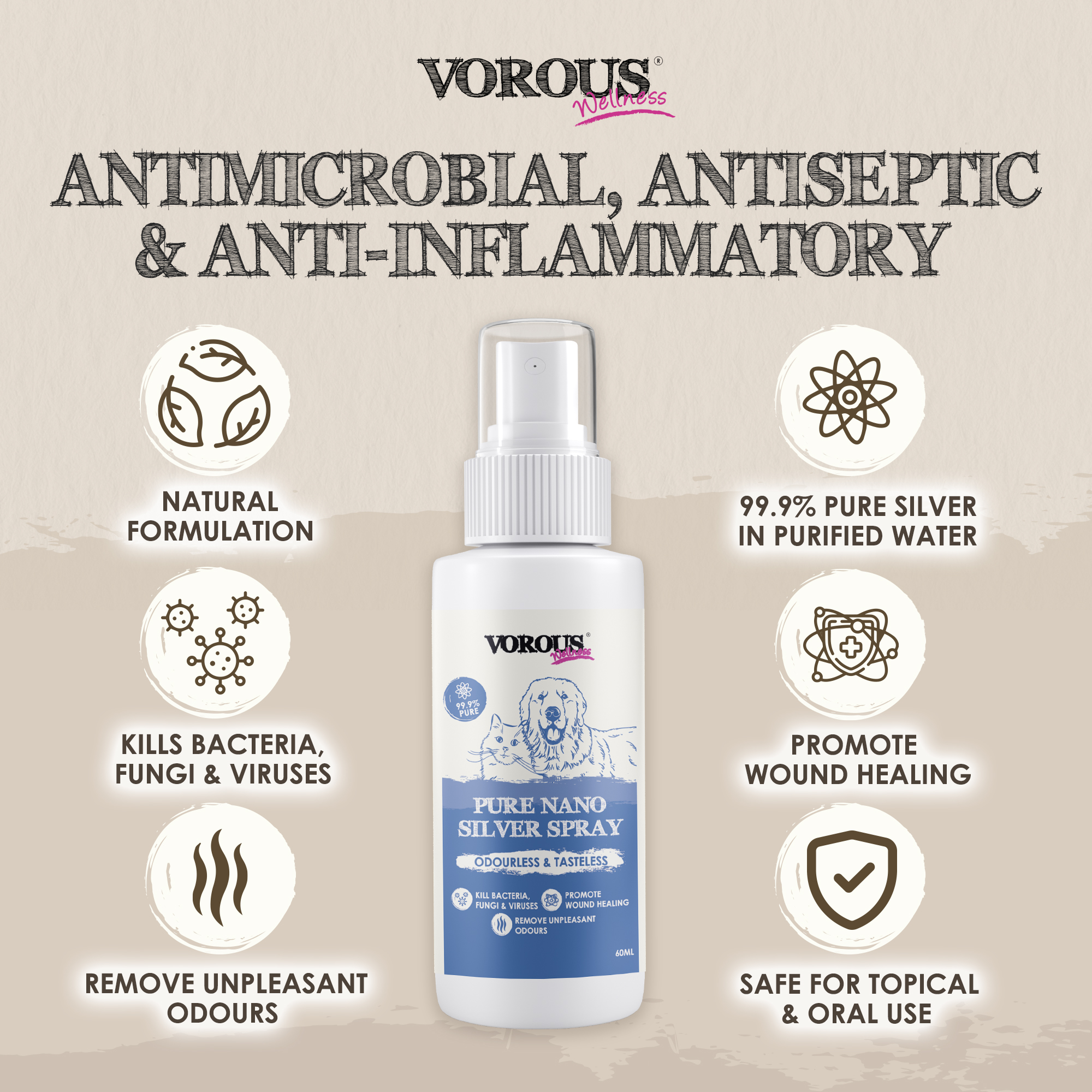 Vorous® Pure Nano Silver Spray for pets is a 99.9% ultra-pure, crystal clear, stable 30 parts per million ionic silver solution. This non-stinging, non-allergenic and non-toxic multipurpose solution has broad-spectrum of antimicrobial, antiseptic and anti-inflammatory properties and naturally treats a wide range of skin conditions as well as ear infections and eye irritations.