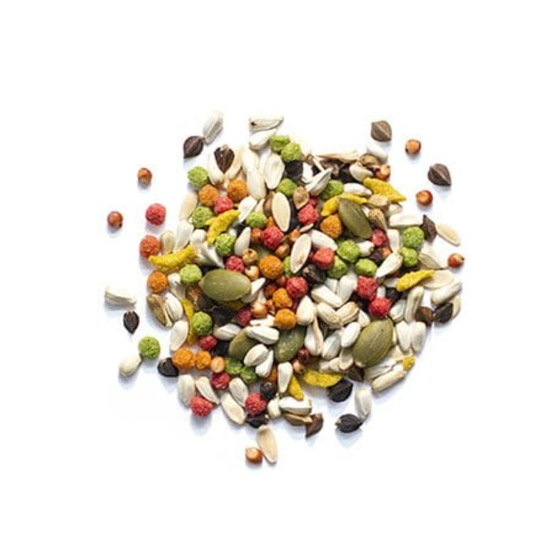 Safflower seeds, Milo, Ground corn, Whole buckwheat, Squash seeds, Shelled pumpkin seeds, Soybean meal, Ground wheat, Wheat germ meal, Sugar, Vegetable oil (preserved with mixed tocopherols), Calcium carbonate, Dicalcium phosphate, Iodized salt, Natural flavors, DL-Methionine, Dried oranges, Dried apples, Dried grapes, Dried bananas, Choline chloride, L-Lysine monohydrochloride, Vitamins (Vitamin E supplement, Niacin supplement, Biotin, d-Calcium pantothenate, Riboflavin supplement, Pyridoxine hydrochloride, Thiamine mononitrate, Vitamin A acetate, Vitamin D3 supplement, Menadione sodium bisulfite complex (source of Vitamin K activity), Vitamin B12 supplement, Folic acid), Citric acid (preservative), Mixed tocopherols (preservative), Yellow 5, L-ascorbyl-2-polyphosphate, Red 40, Yellow 6, Minerals (Manganous oxide, Zinc oxide, Copper sulfate, Sodium selenite, Calcium iodate), Color added, Blue 1